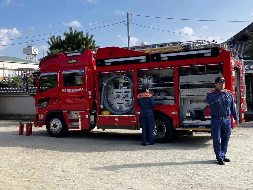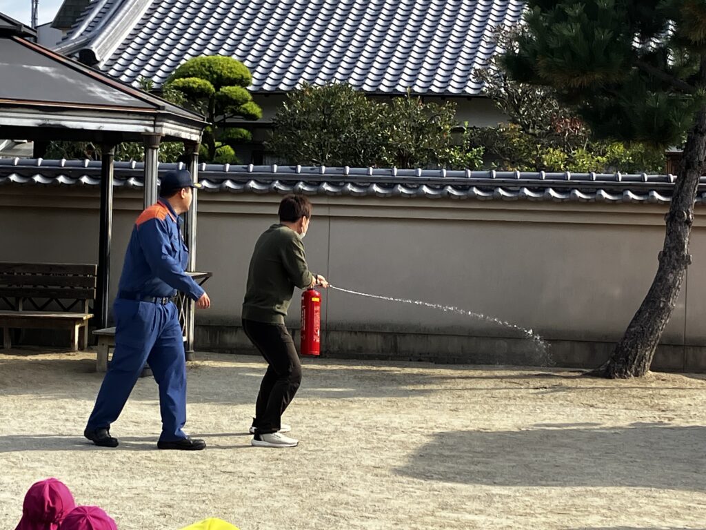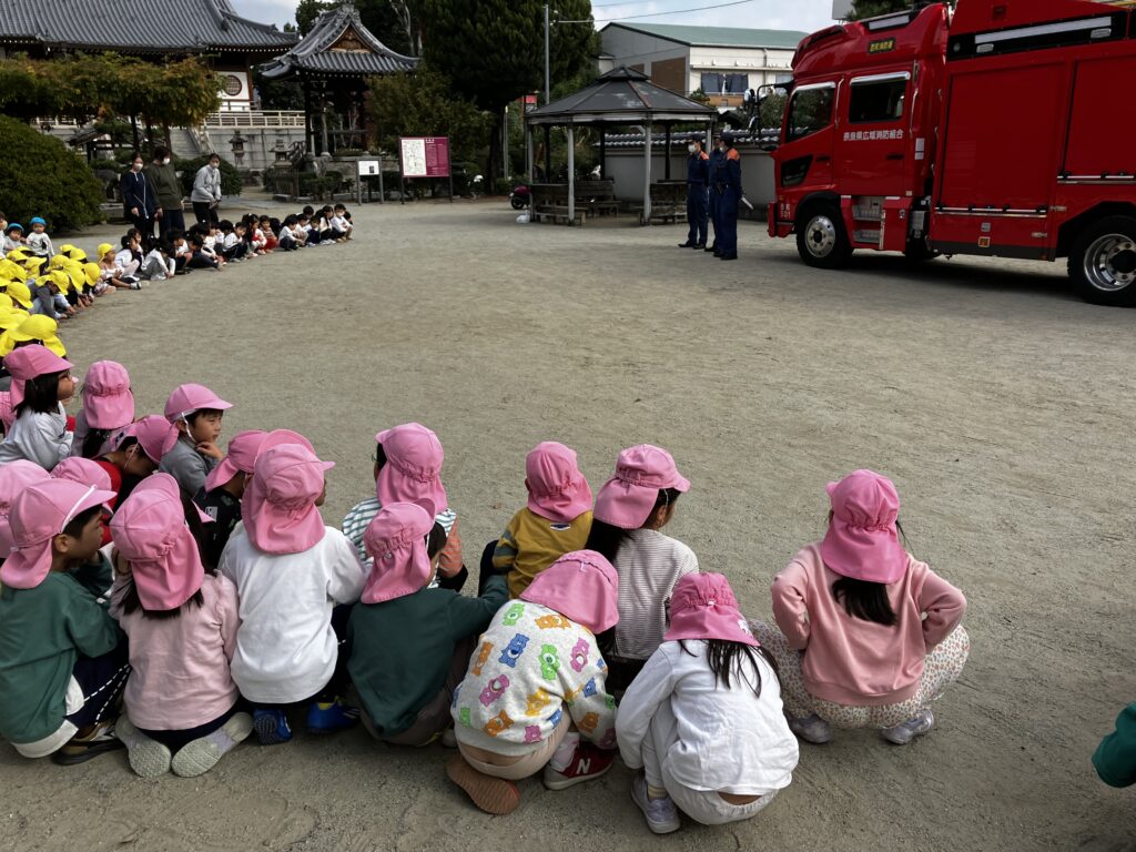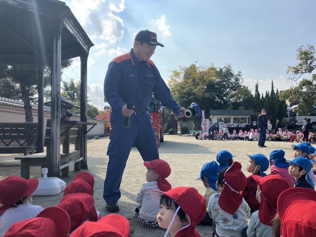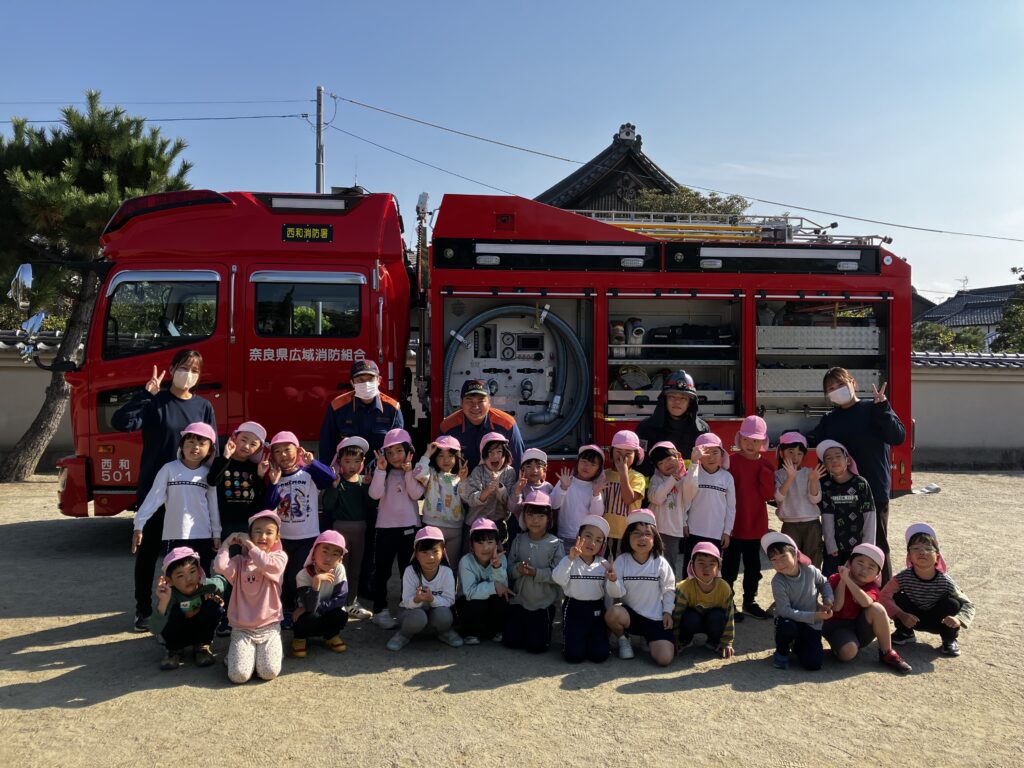 立ち合い訓練をしました。 2025/11/28 11月の避難訓練は西和消防署さんに来ていただき立ち合い訓練をしました。 避難訓練の後は消防士さんからのお話を聞きました。 消防車の中も見せてもらい、放水器具も触らせてもらいました。 職員も、もしもの時に備えて防災訓練をしました。 最後は消防士さんと一緒に写真も撮りました。かっこよかったね!!