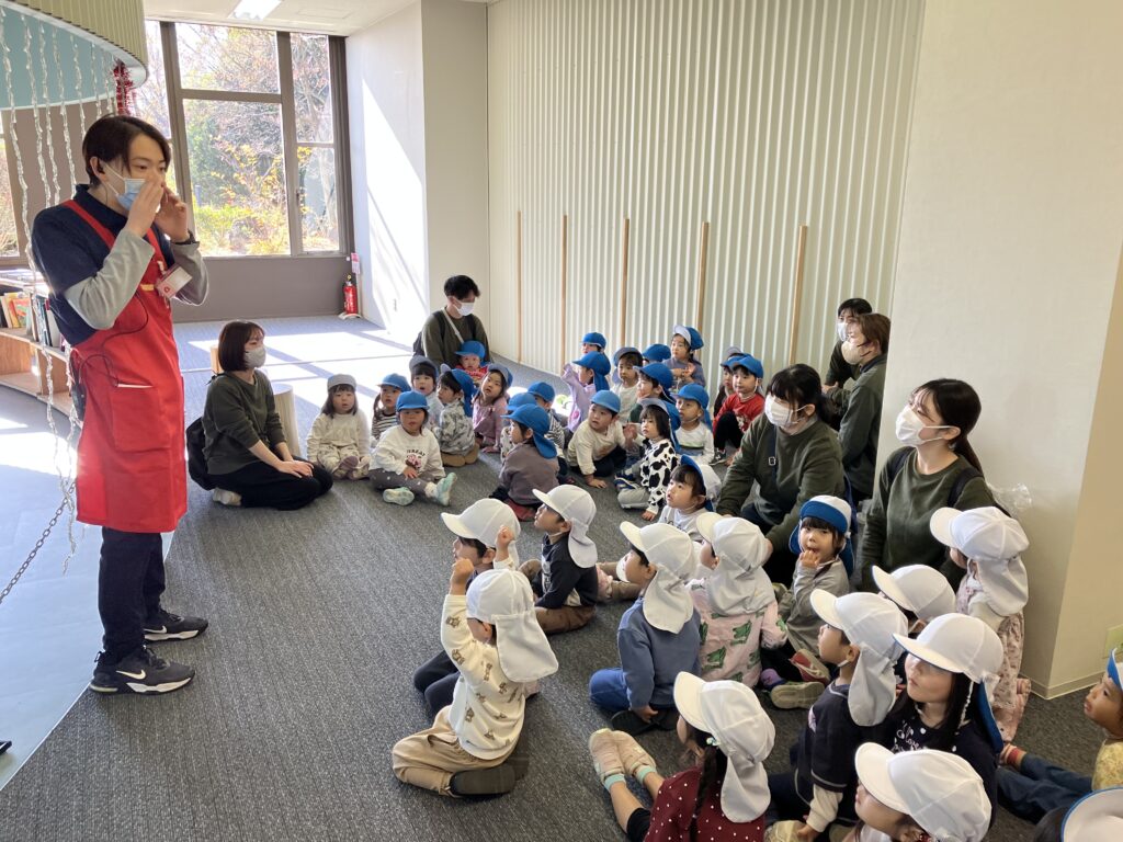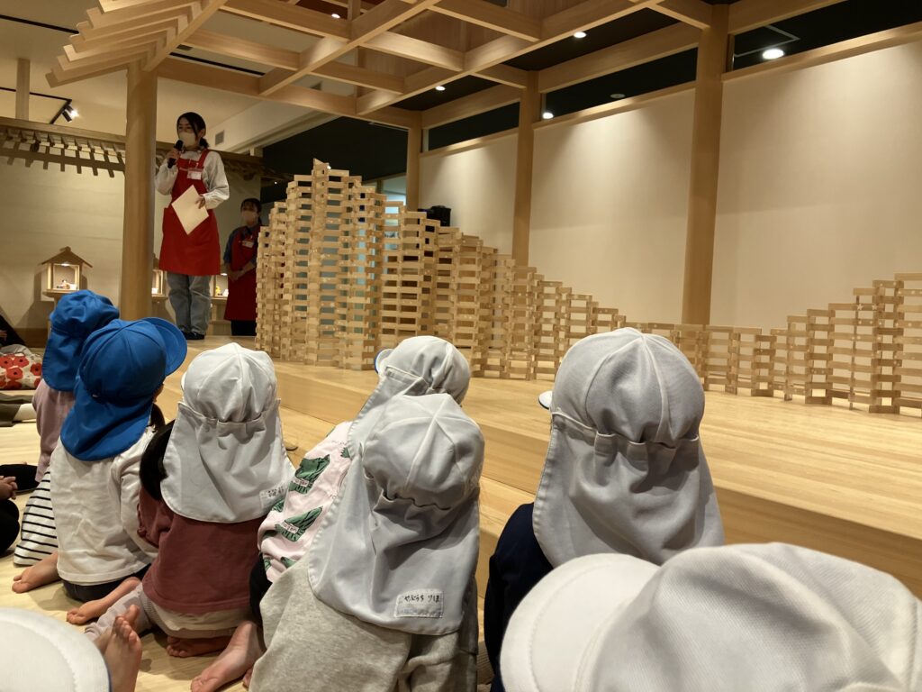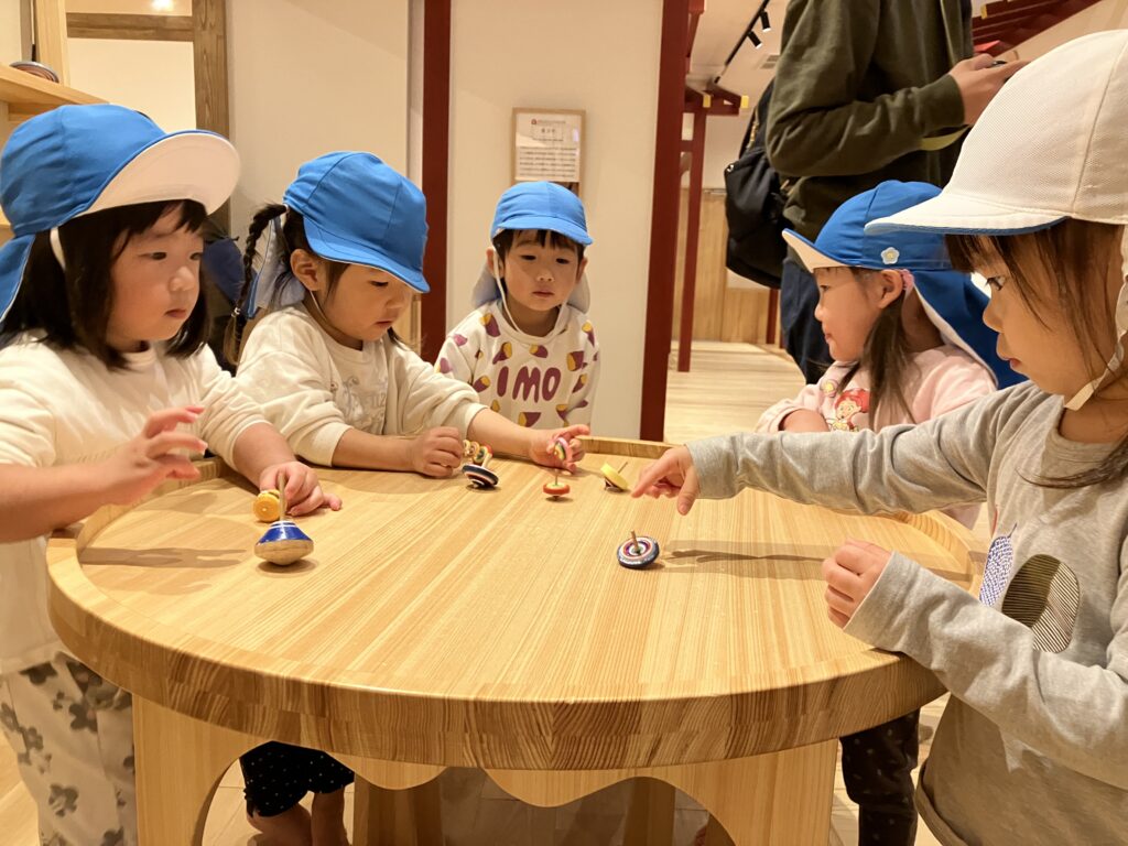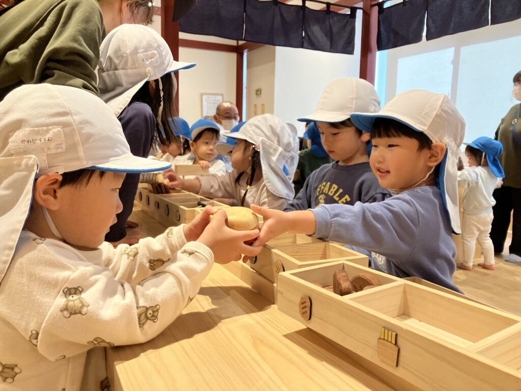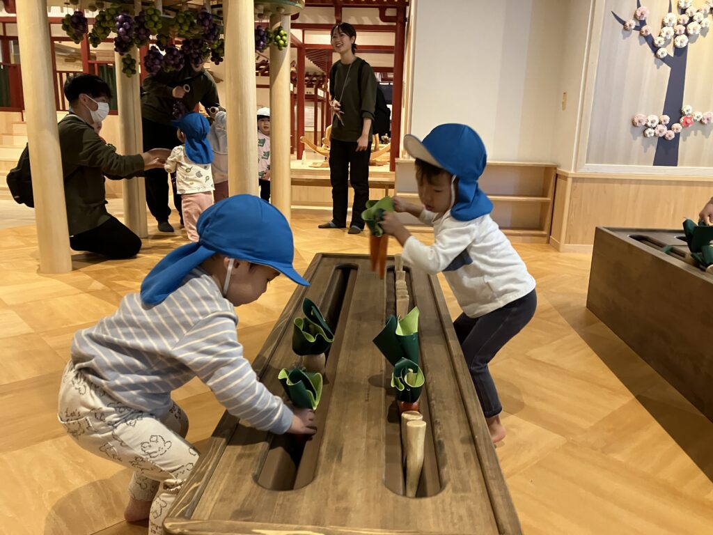 奈良おもちゃ美術館に遠足! 2025/12/19 バスに乗って出発〜♪車窓からの景色を見るのも楽しいね! スタッフの方から遊び方を聞きました!ドキドキわくわく…♪ こま回しや… 木の滑り台も滑ったよ♪ にんじんや大根を沢山収穫したよ! お店屋さんごっこも楽しいね♪「お待たせしました!召し上がれ〜♪」 たり最後にカプラの解体ショーを見ました。次々に崩れていく積み木を目で追ったり、ガラガラと崩れる音に驚いたりと楽しんでいました♪