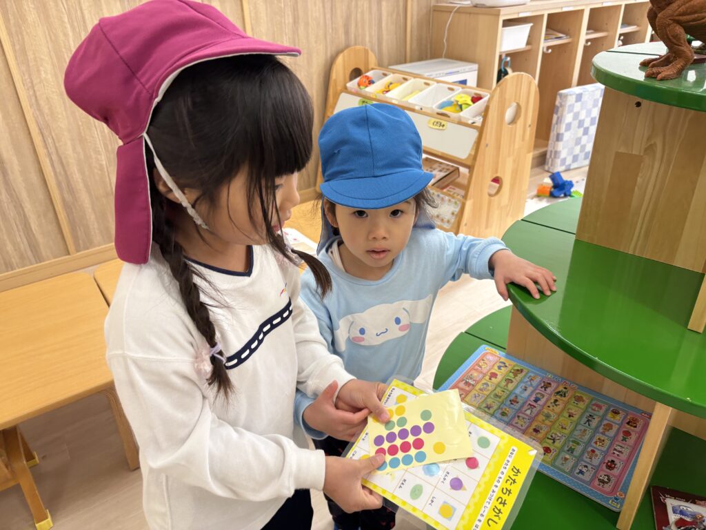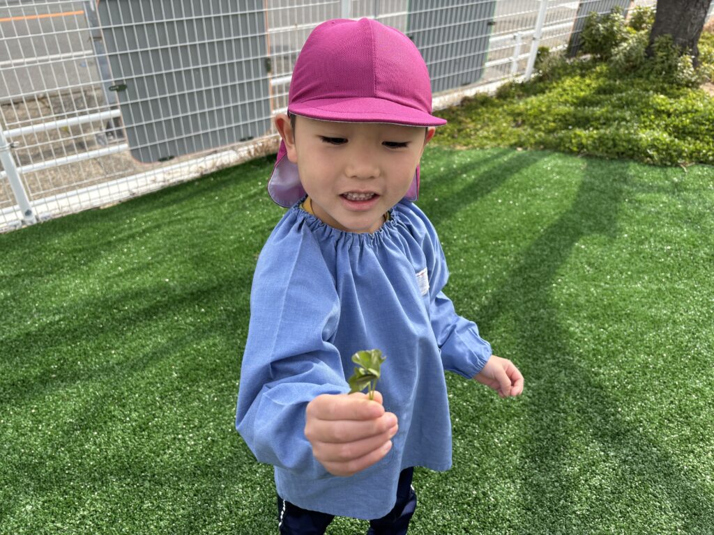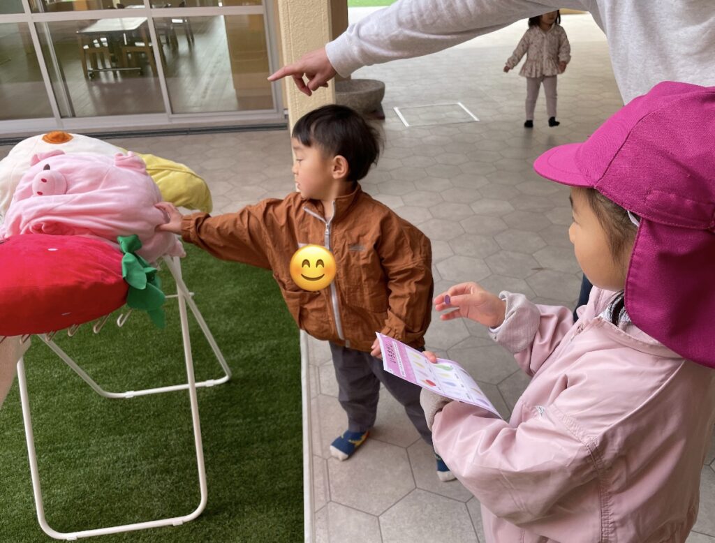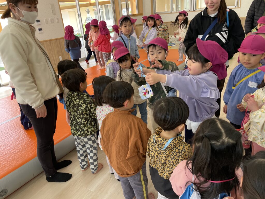4歳児第2園に遊びに行ったよ! 2026/2/20 三輪車押してあげたよ! ゆらゆらと優しく揺らしていましたよ。 一緒にクローバー探そう! 四葉のクローバーを発見したようです♪ 遊戯室ではお相撲ごっこを楽しみました。はっけよい、のこった! 形探しゲームをしました。丸やハートどこにあるかな? 色探しゲームもしました!ピンク見つけたよ⭐︎ 最後にはメダルをプレゼント!また遊ぼうね♪