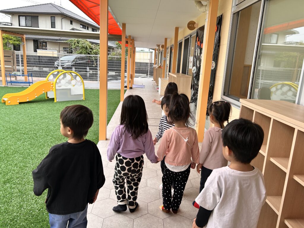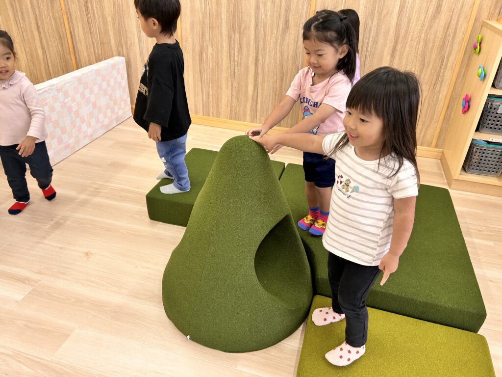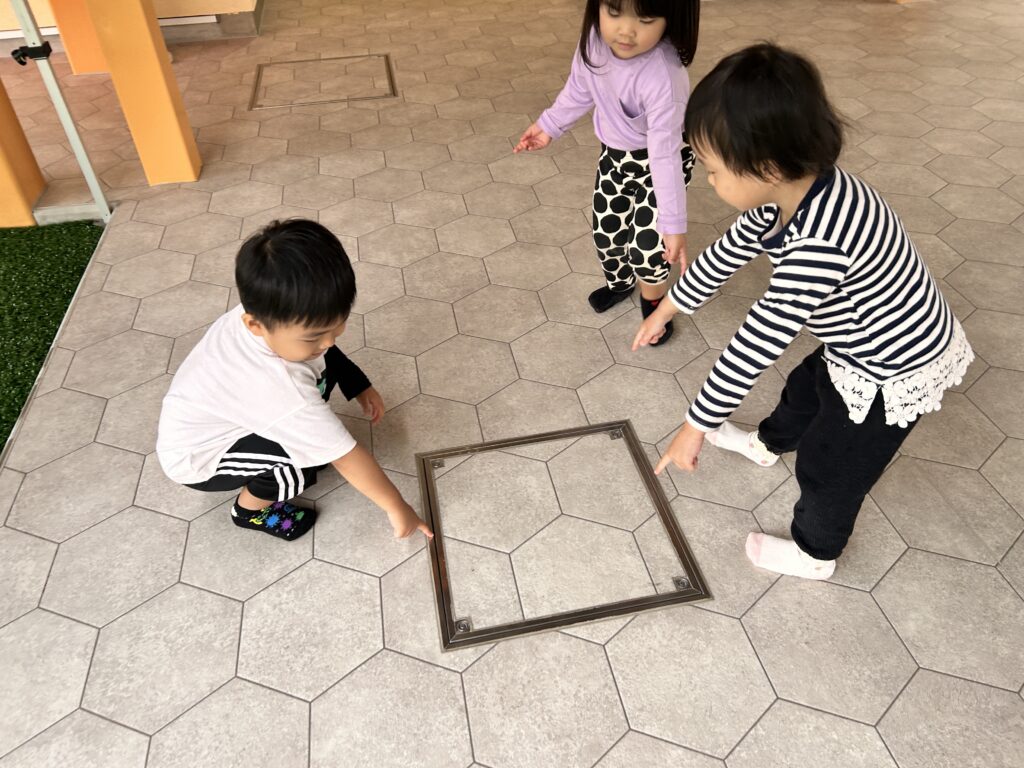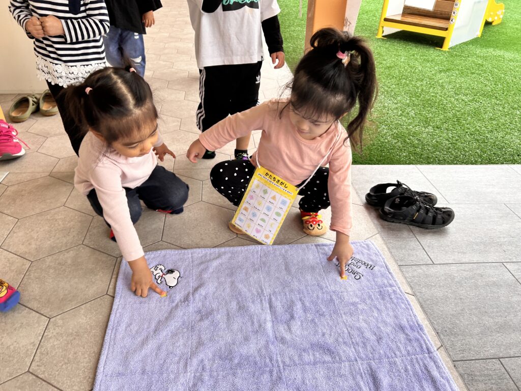 2025/10/22 2歳児 かたち探し 2歳児では様々な形やその名前を知り、『かたちカード』を使って生活の中に隠れている身近な形を探す遊びを楽しんでいます。 「しかくあったよ~!」 「これってさんかく?」 「このマットにお星さまあるよ!」 異年齢児のお部屋や廊下など園内散策をしながら、様々な形に触れ興味を深める子どもたちです☆