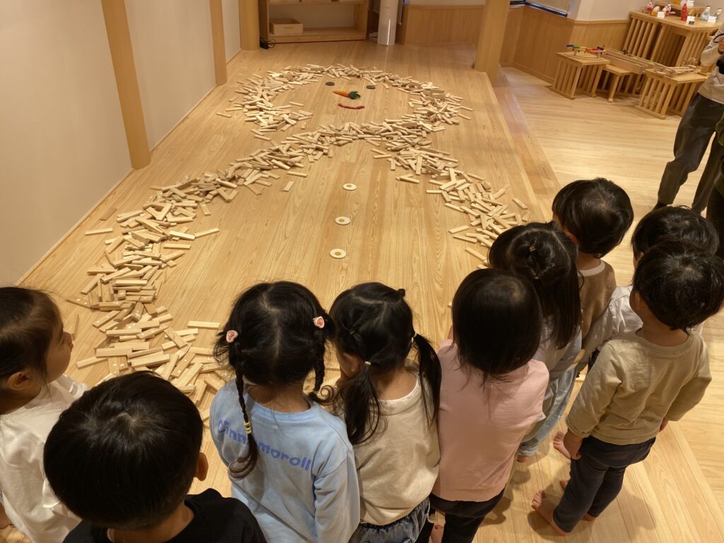 そして最後は、積み木のショーを見学しました。「お手伝いしたい人~!」と聞かれると、たくさんのお客さんが手を挙げ、ばら組も負けじとみんなが手を挙げていました。ジャンケンで決めることになり、最後まで勝ち残ったのはばら組でした!緊張しながらも、スタッフの方と下の積み木を抜くと、、、!