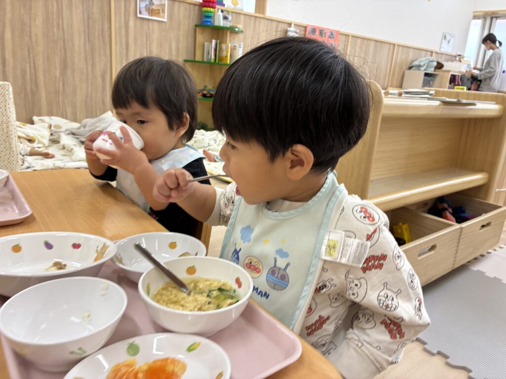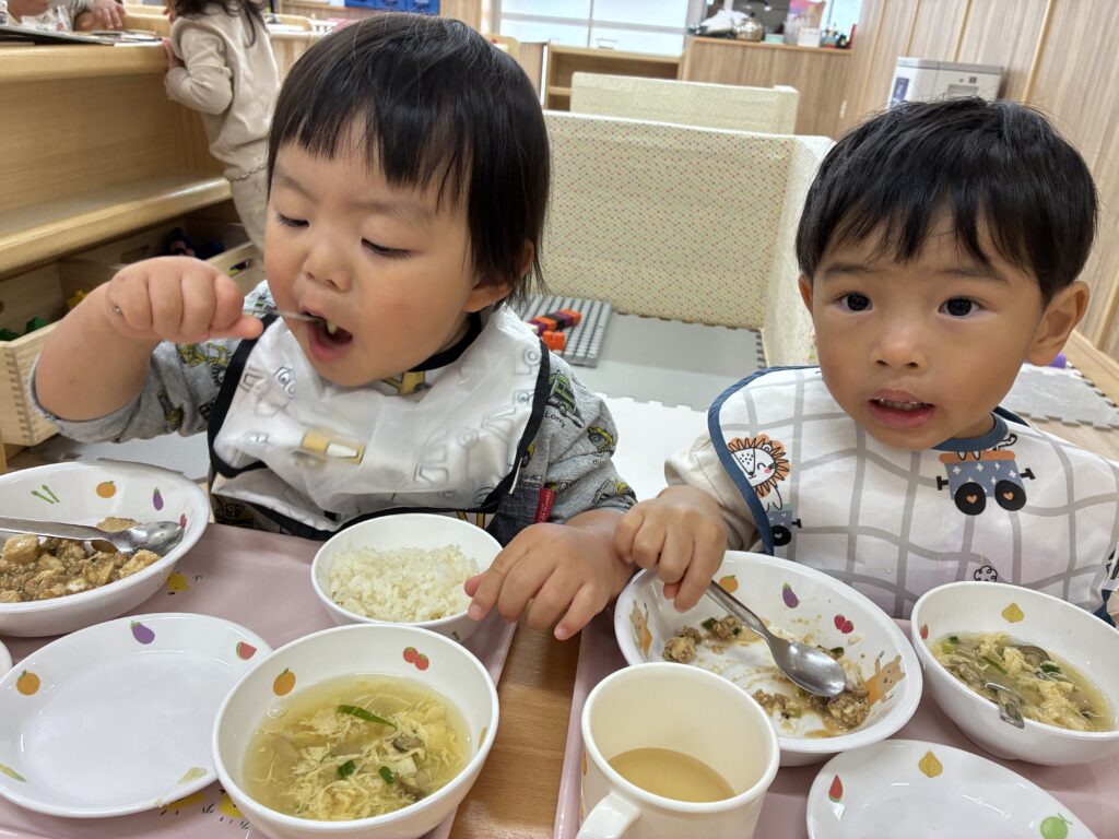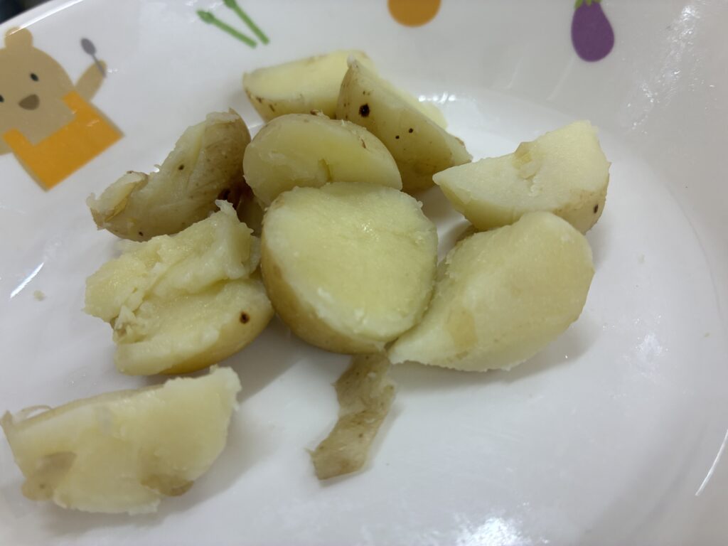 2025/12/12 1歳児 おいしいね♪ 先日、園の畑でとれたじゃがいもを… 塩をふって蒸した状態で給食でいただきました!!皮も薄くてホクホク!おいしそ~♫ 「畑でとれたじゃがいもだよ。」というと、みんな目をキラキラさせて口に運びます。そのまま食べたり、マヨドレをつけたりして味わう子どもたち! あっという間にお皿は空っぽ。採れたての新鮮なじゃがいも、おいしかったね!!