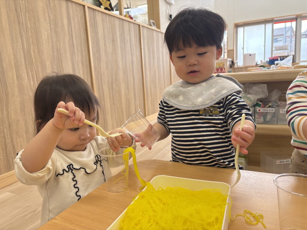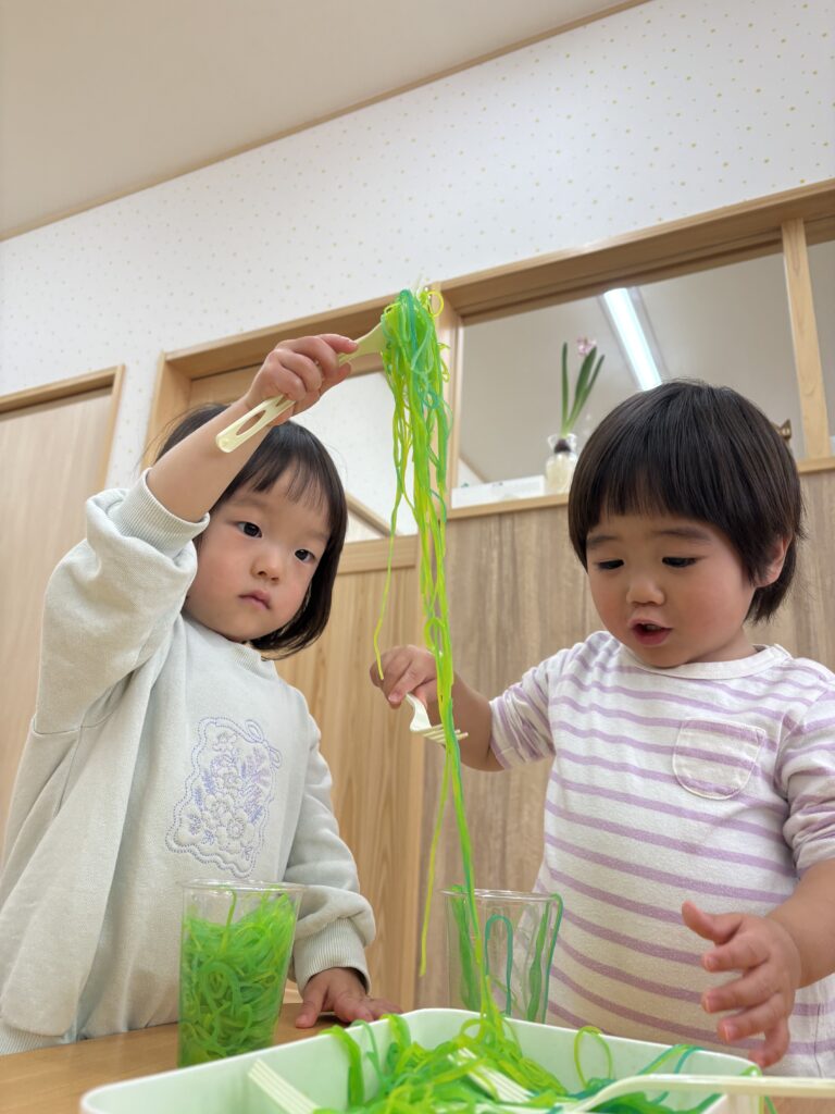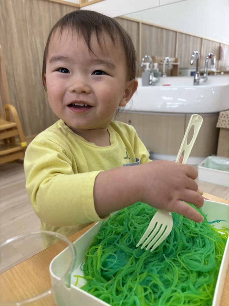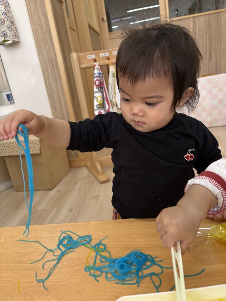 2026/3/6 0歳児 カラフル春雨 感触遊びが大好きなふじ組さん カラフルな春雨に興味津々! フォークで混ぜるのもおもしろいよ🎵 容器に詰めてジュースに見立てて遊んだり 、思い思いに楽しんでいましたよ。