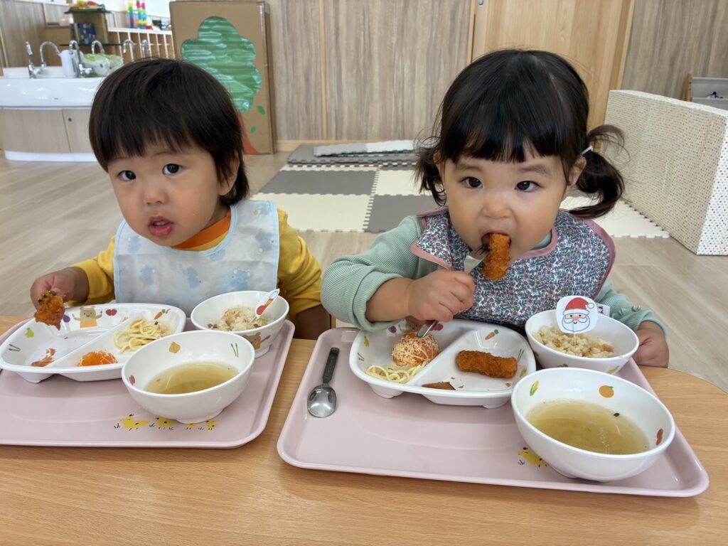 2025/12/24 給食室 メリークリスマス🎄 12月23日クリスマス会があり、この日は給食も特別メニューで、ランチプレートでの提供でした。オニオンスープ、エビフライ、ウインナー、スパゲティサラダ、ピラフとお子様ランチ風でいつもと違う雰囲気で楽しい時間でした! 先生お手製のクリスマス仕様のピックでわくわく いっぱいモグモグ❣️ おいしいね!