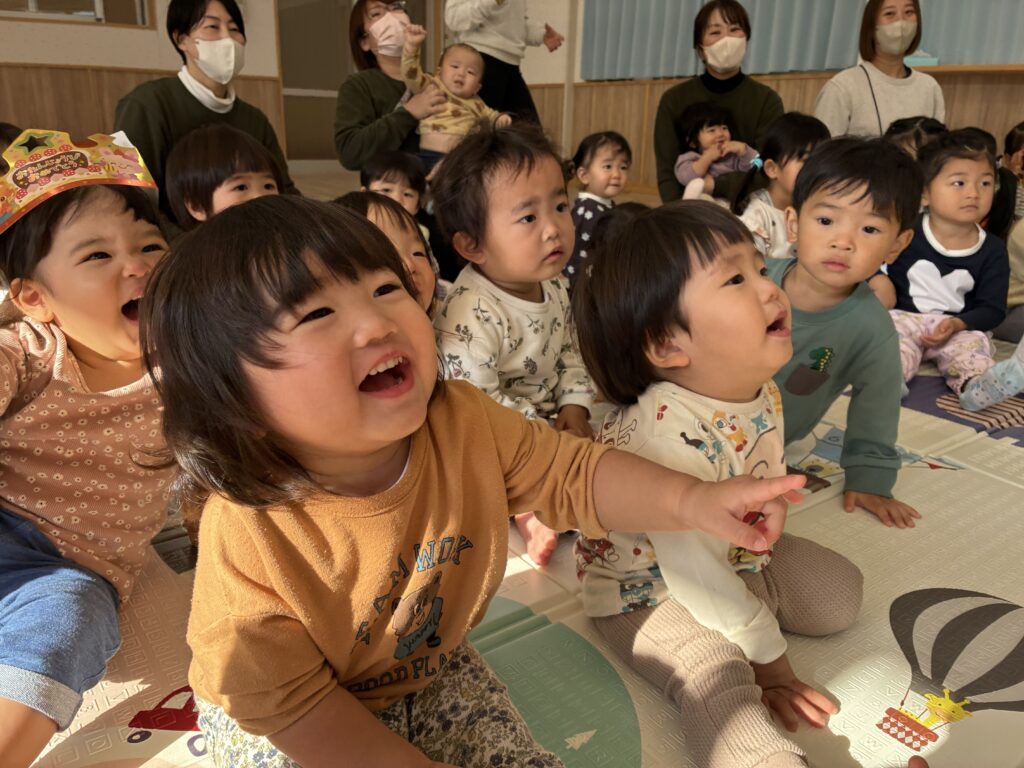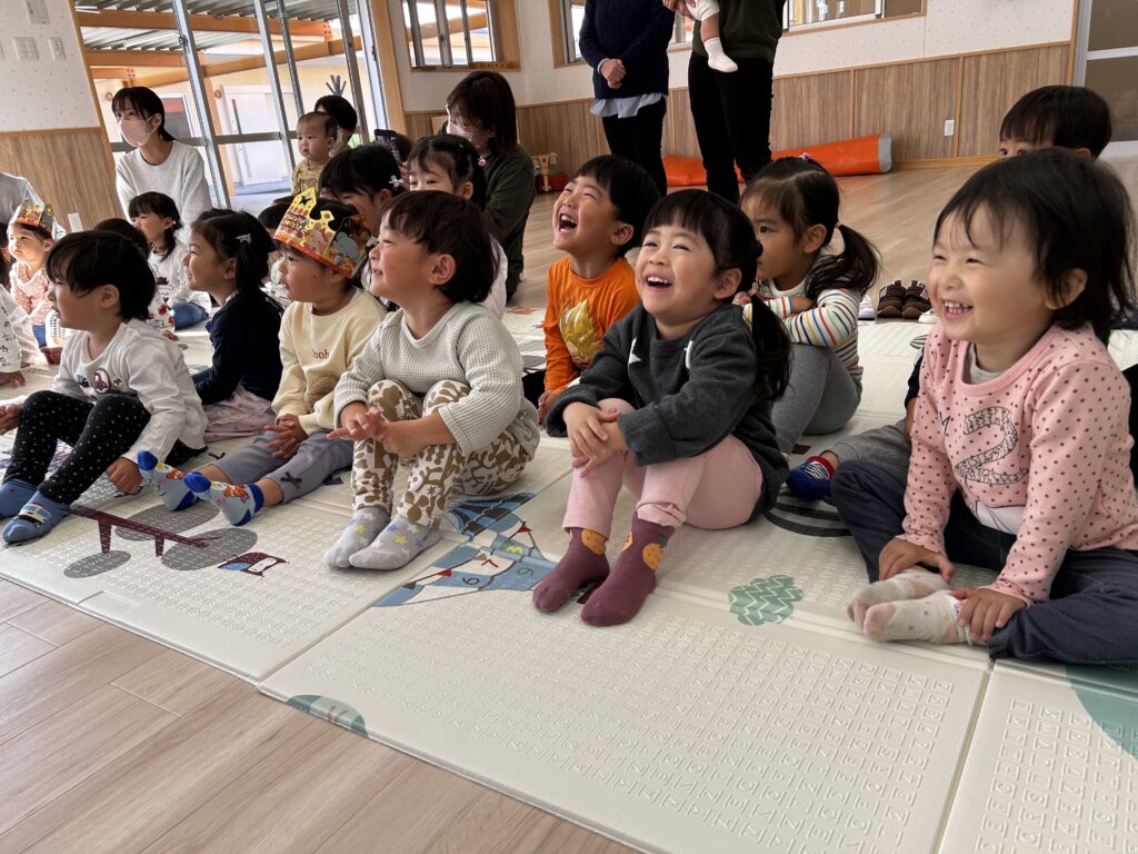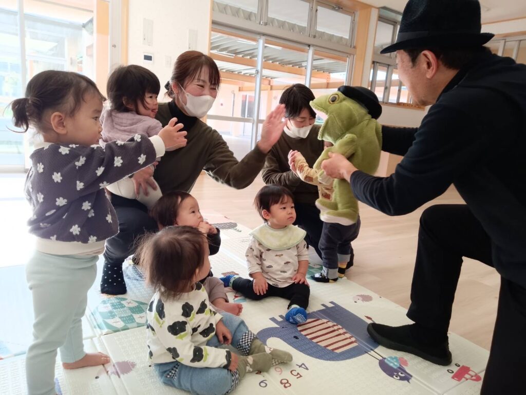 2025/12/16 人形劇団『ダブダブ』さん 人形劇団『ダブダブ』さんが来てくれました!! 大型仕掛け絵本や人形劇など楽しいことがいっぱい☆ 遊戯室が子どもたちの笑顔と笑い声であふれていました♫ お別れはカエルの人形さんと”ハイタッチ!”とっても楽しかったね♫ ダブダブさん、ありがとうございました☆☆